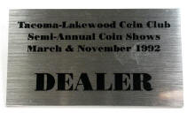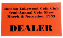 Tacoma-Lakewood Coin Club Show badge (2 x 3.5 inches, silver with black