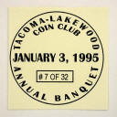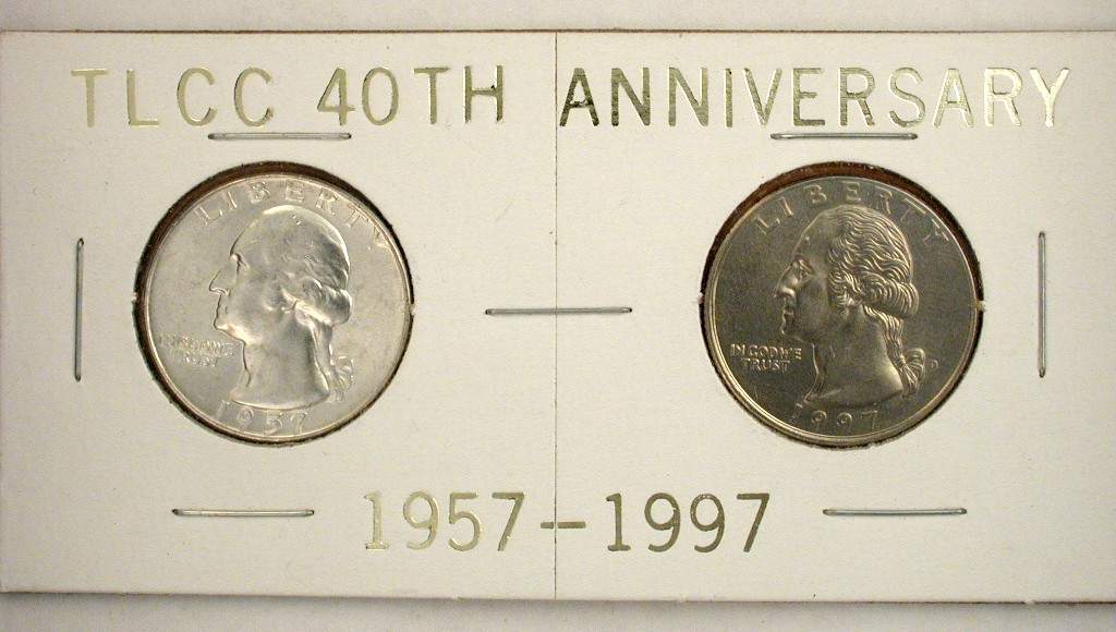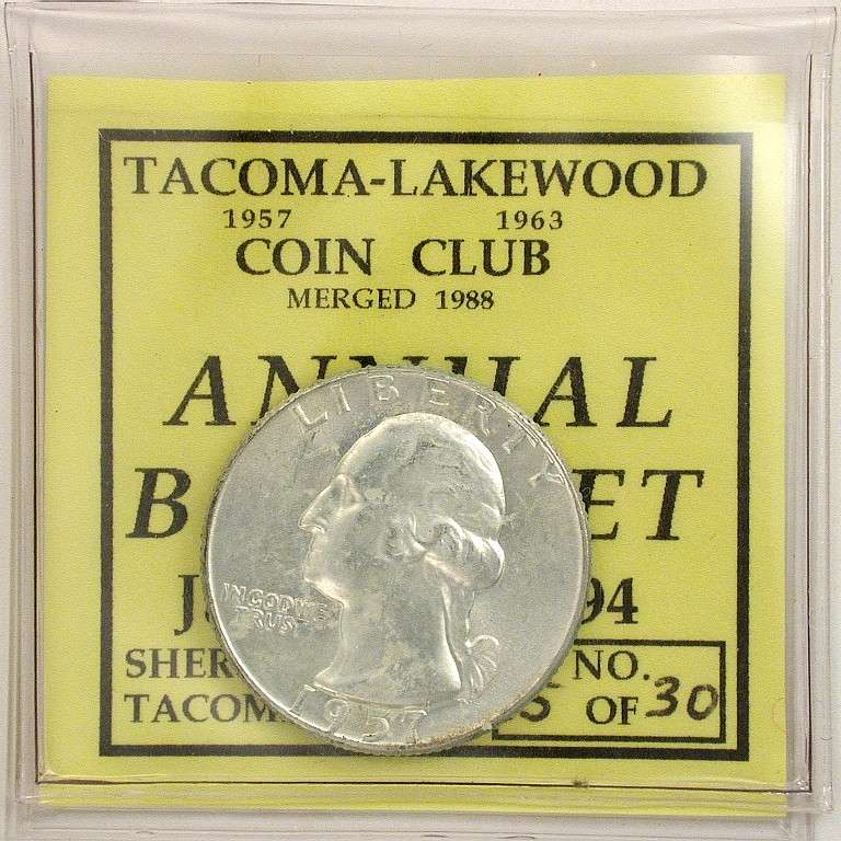S94-1 banquet favor with 1957-D Washington Quarter in a 2 x 2 inch flip with a 1¾ inch square insert TLCC Annual Banquet, January 4, 1994, Tacoma, Washington 30 made |