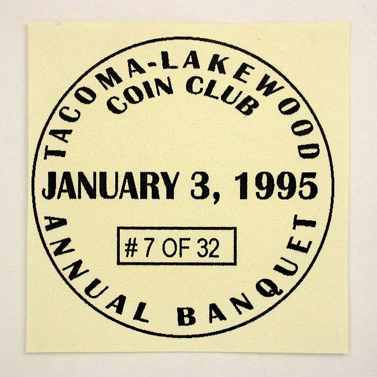 S95-1 banquet favor with 1977-S proof Eisenhower Dollar in a 2 x 2 inch flip with a 1¾ inch square insert TLCC Annual Banquet, January 3, 1995, Tacoma, Washington 32 made |