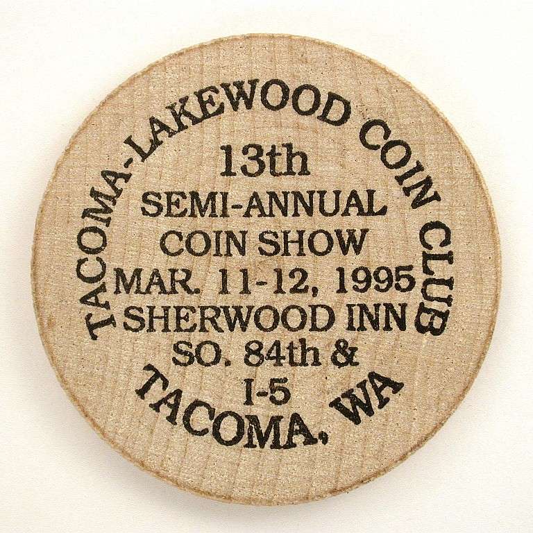 S95-2 wooden nickel, 38 mm TLCC 13th Semi-Annual Coin Show, March 11-12, 1995, Tacoma, Washington Black obverse and reverse, 1,000 made Due to declining coin show attendance and increased costs, no wooden nickels were made after 1995. |