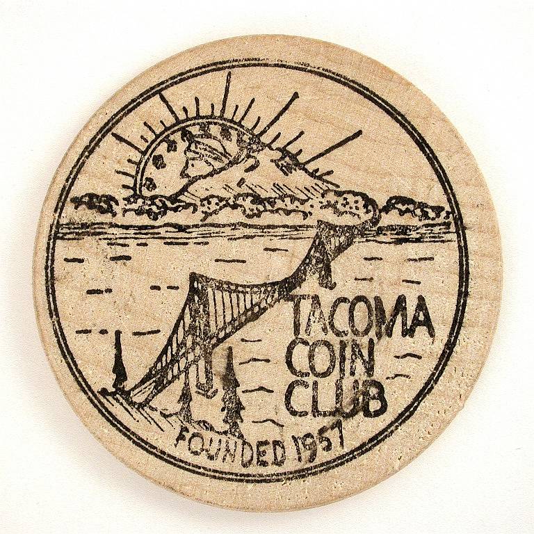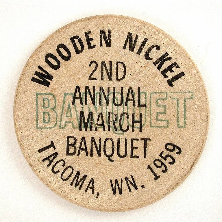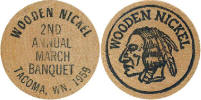 S59-2a wooden nickel, 38 mm 2nd Annual March banquet, Tacoma, Washington 5 known Notice the abbreviation "WN." for Washington that was in use at that time! |