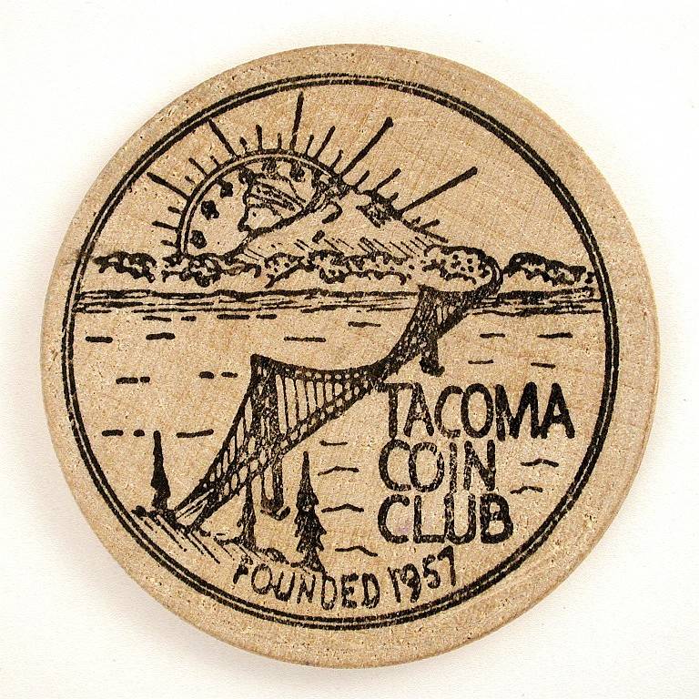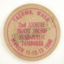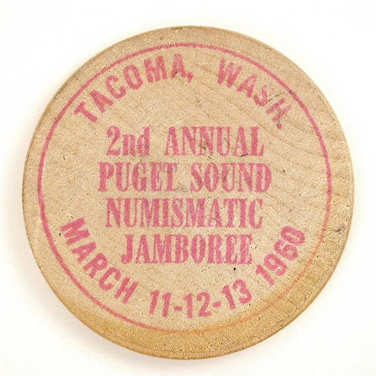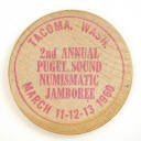 S60-1a wooden nickel, 37.5 mm 2nd Annual Puget Sound Numismatic Jamboree March 11-13, 1960, Tacoma, Washington Red obverse, black reverse - 1 known |
