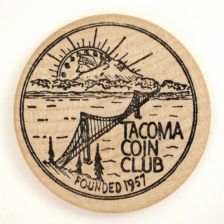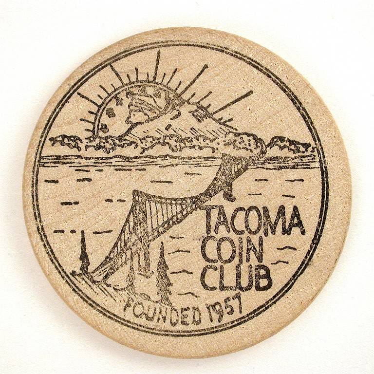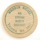 S61-1 wooden nickel, 38 mm 4th Annual March Banquet, Tacoma, Washington Green obverse, black reverse - 5 known |