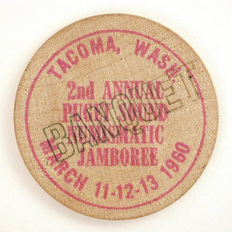 S60-1b wooden nickel, 37.5 mm 2nd Annual Puget Sound Numismatic Jamboree March 11-13, 1960, Tacoma, Washington Red obverse with green "BANQUET" overprint, black reverse - 3 known |