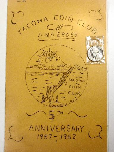 S62-1 banquet program with Jefferson Nickel attached, 5.25 x 8 inches TCC 5th Anniversary Banquet March 23, 1962, Tacoma, Washington 80 made, 1 known |