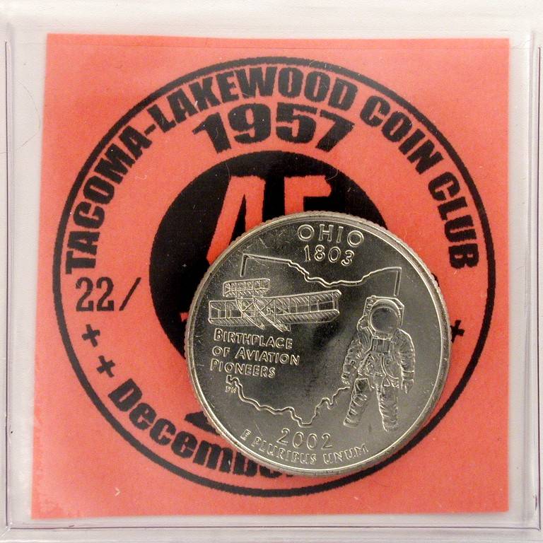 S02-1 holiday party favor with 2002-D Ohio State Quarter in a 2 x 2 inch flip with a 1¾ inch square insert TLCC annual holiday party, December 3, 2002, Lakewood, Washington |