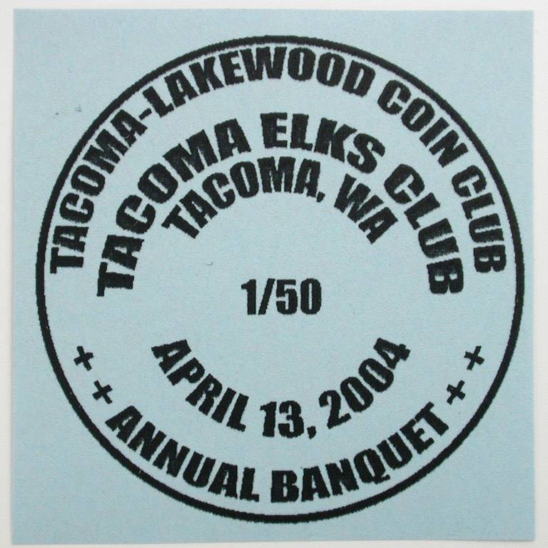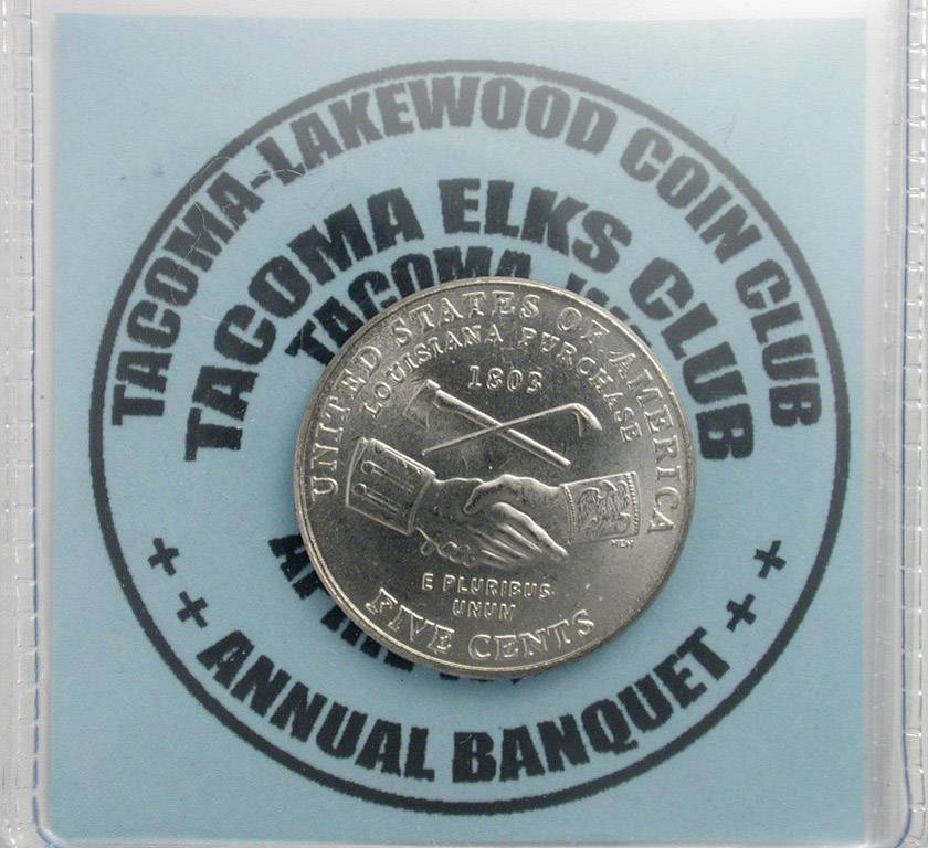 S04-1 banquet favor with 2004 Jefferson Nickel with "Indian Peace Medal" design reverse in a 2 x 2 inch flip with a 1¾ inch square insert TLCC annual banquet, April 13, 2004, Tacoma, Washington (Tacoma Elks Lodge) |