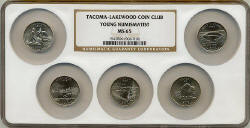 2006S06-2 TLCC Young Numismatist set of 2005 quarters in NGC multi-coin holder graded MS 65 (courtesy of NGC at the request of Norm Mikat). Quantity: 10 sets received April 2006 (one in club collection; remainder available to YN's based on merit or as decided by the board of directors). |