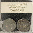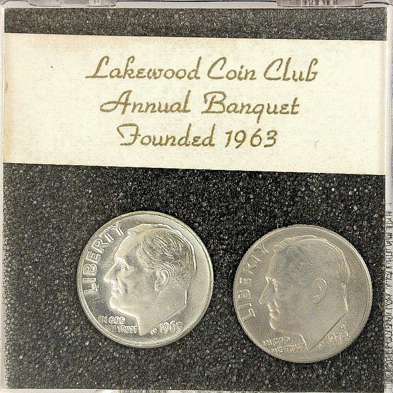 S74-1 banquet favor with 1963-D and 1974-D Roosevelt Dimes on black foam in a 2-1/8 inch square hinged plastic holder with snap closure. Lakewood Coin Club Annual Banquet, 1974 |
