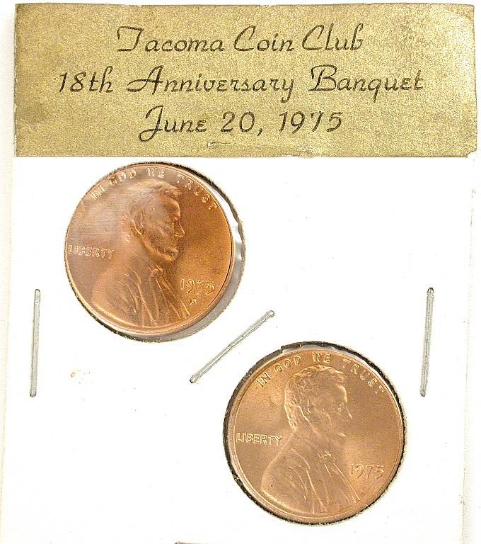 S75-1 banquet favor with 1975 and 1975-D Lincoln Cents in a 2 x 2 inch holder with a 2 x 5/8 inch gold sticker attached TCC 18th Anniversary Banquet, June 20, 1975, Tacoma, Washington |