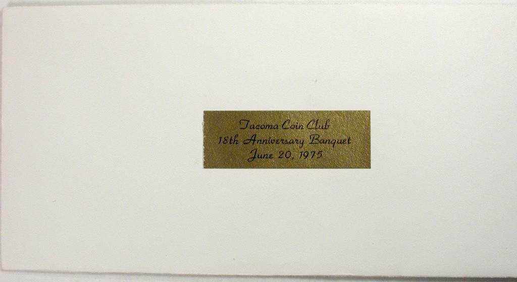 1975 S75-2 banquet favor. Inner envelopes contain Series 1969C $1 Federal Reserve Notes with serial numbers L23389700C to 799C (100 made), 3-1/8 x 6½ inches Tacoma Coin Club 18th Anniversary Banquet, June 20, 1975, Tacoma, Washington |