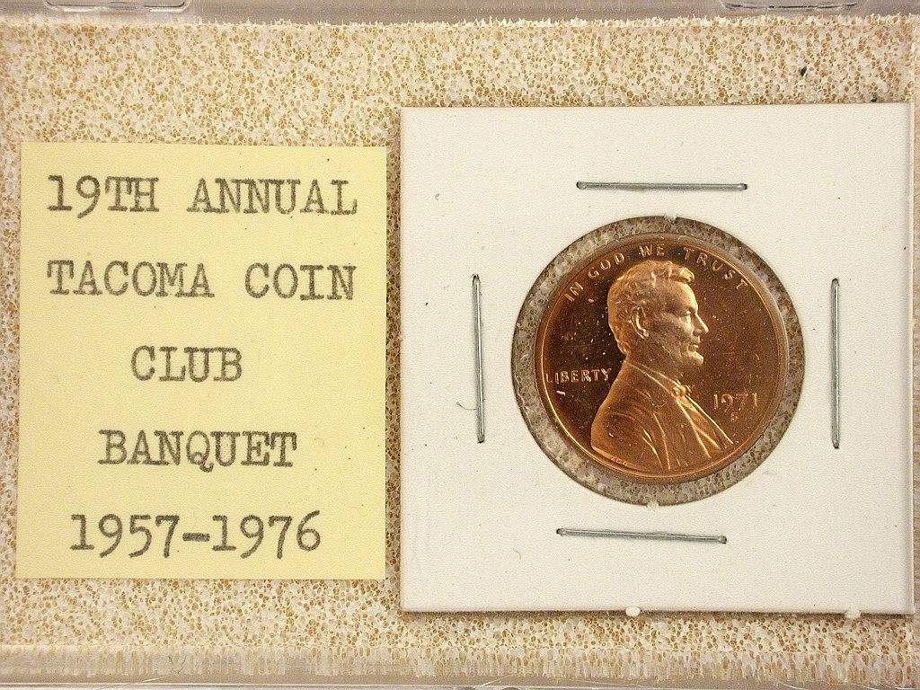 S76-1a banquet favor with 1971-S proof Lincoln Cent in a cardboard holder on light tan foam in a 2-1/8 x 3 inch hinged plastic holder with snap closure. 19th Annual Tacoma Coin Club Banquet, 1976 |