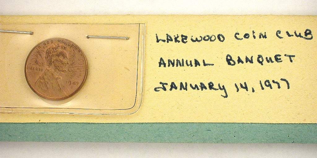S77-1 banquet favor with 1947-S Lincoln Cent attached to banquet "tent" card, 1½ x 4½ inches when folded. Lakewood Coin Club Annual Banquet, January 14, 1977 |
