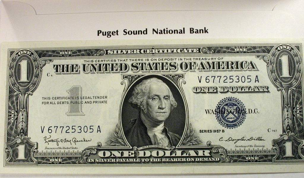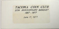 1977 S77-2 banquet favor. Inner envelopes contain Series 1957B $1 Silver Certificates with serial numbers V67725300A to 399A (100 made), 3-1/8 x 6½ inches Tacoma Coin Club 20th Anniversary Banquet, June 17, 1977, Tacoma, Washington |
