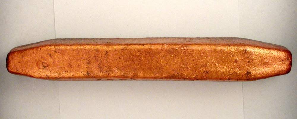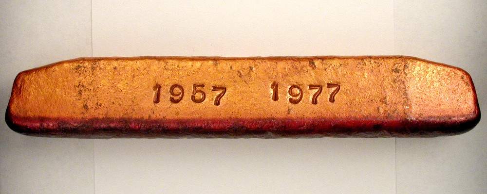 1977 S77-3 copper ingot, 17 x 19 x 108 mm (approx), front and top views shown Tacoma Coin Club 20th Anniversary (1957-1977) Made by Jack Rand, 3 known |