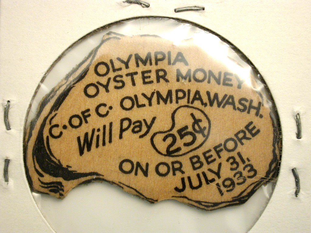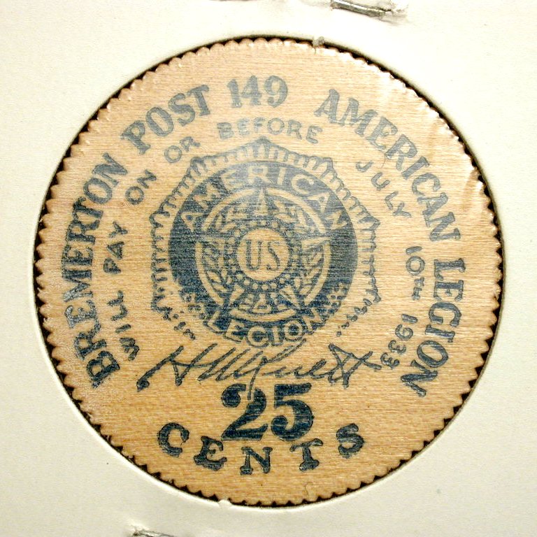 Samples of 1933 wooden money from Bremerton, WA featuring "Old Ironsides."