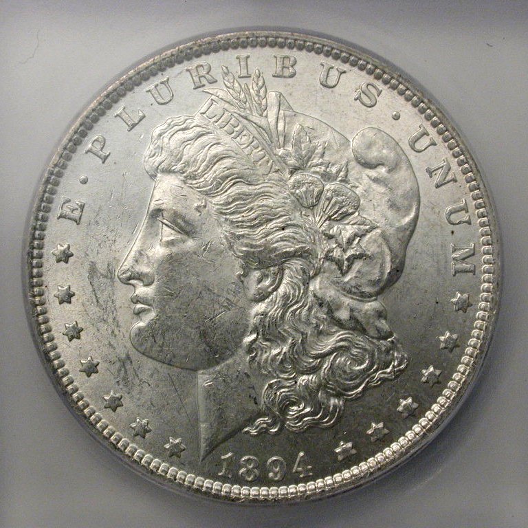 Left: 1876 Quarter Dollar, formerly in club collection. Right: 1894 Morgan Dollar, ICG AU-58.