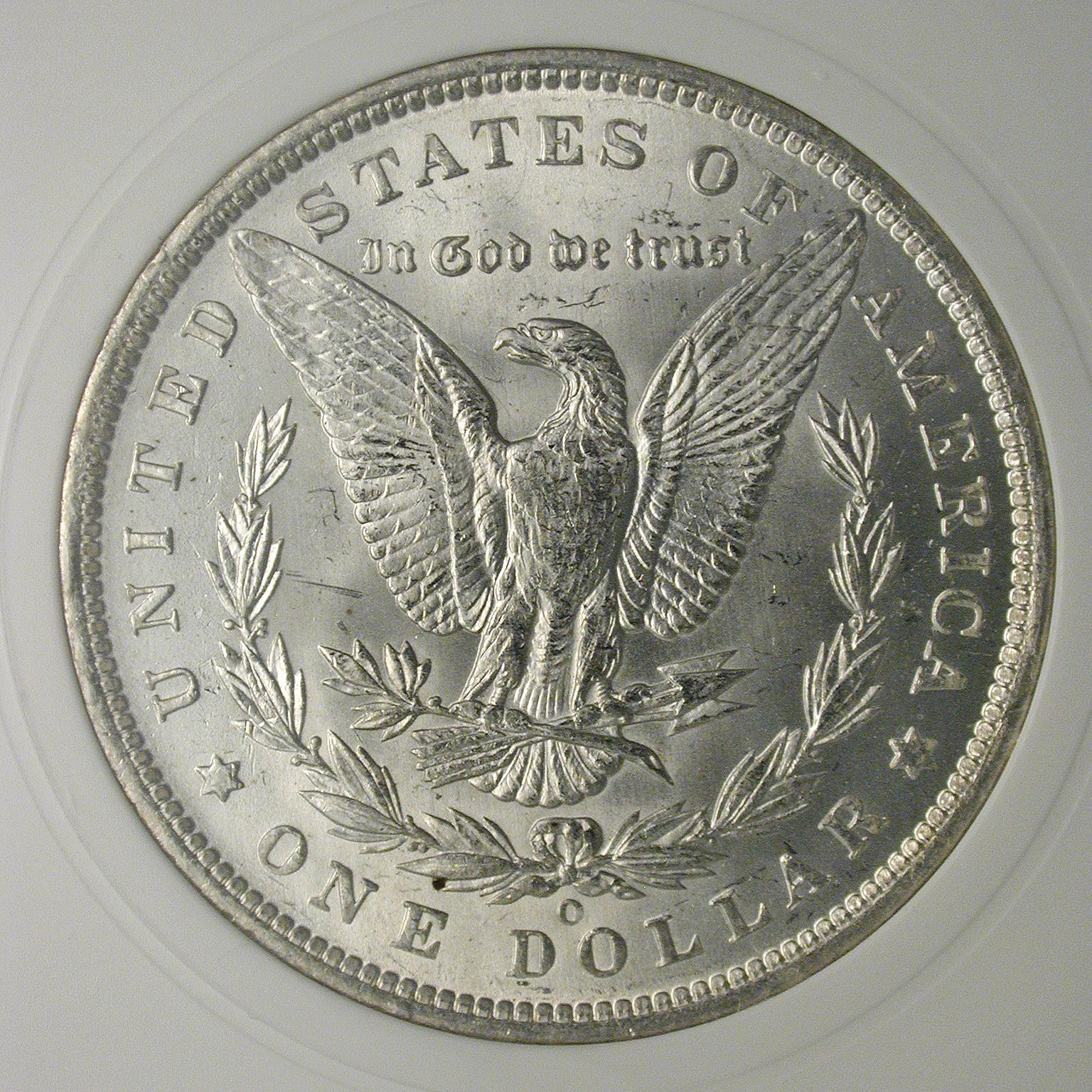 Left: 1890-O Morgan Dollar, PCI MS-64.