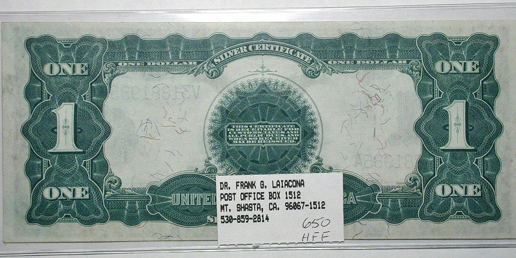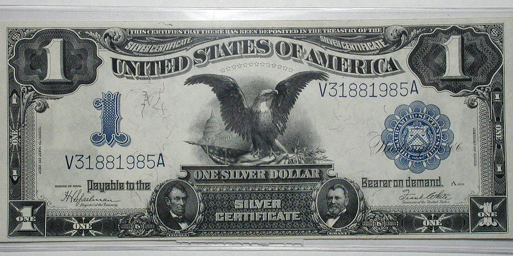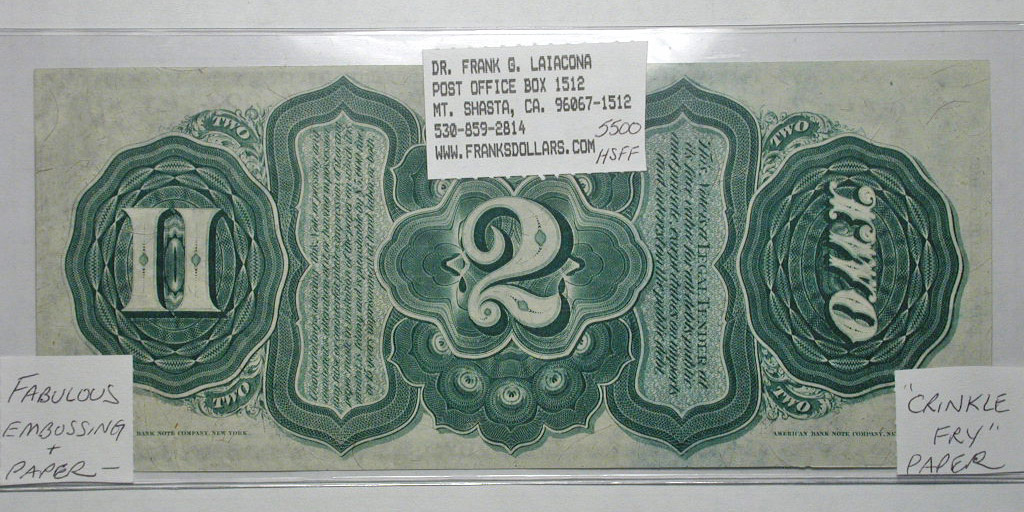 Top: 1863 US $2 "rainbow" note. Bottom: 1899 US $1 "black eagle" silver certificate.