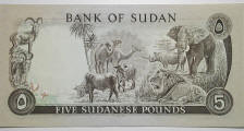 Bank of Sudan Five Sudanese Pounds banknote depicting African wildlife.