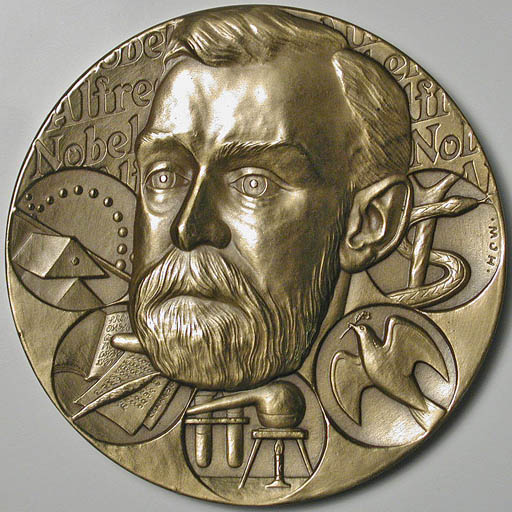 Right: Medal honoring Alfred Nobel and the Nobel Prizes.