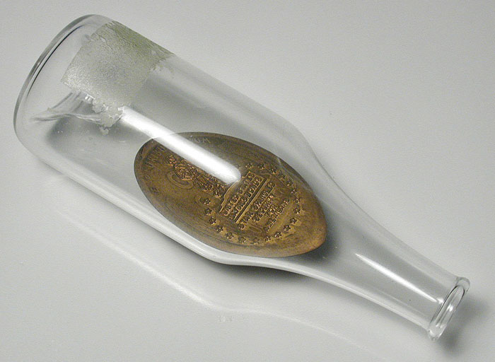 War Savings Bonds "penny in a bottle" elongated cent made from a "wheatear" Lincoln Cent.