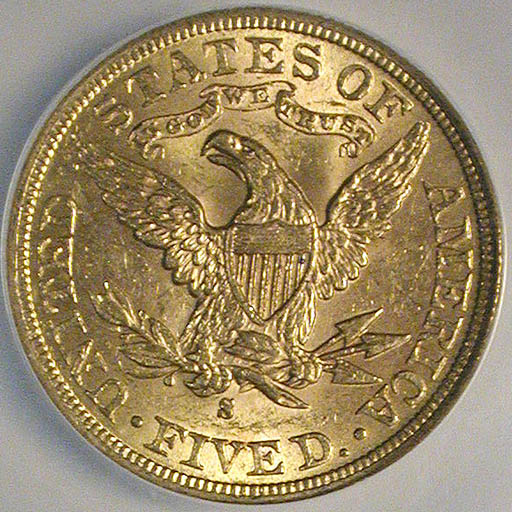 Left: 1886-S Half Eagle ($5 gold), NCS GSA Genuine. Right: 1905-S Double Eagle ($20 gold), NGC GSA XF-45.