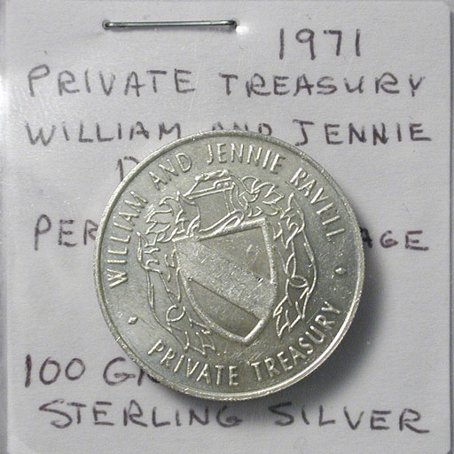 Right: 1971 "Private Treasury" silver coin of William and Jennie Ravell.