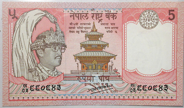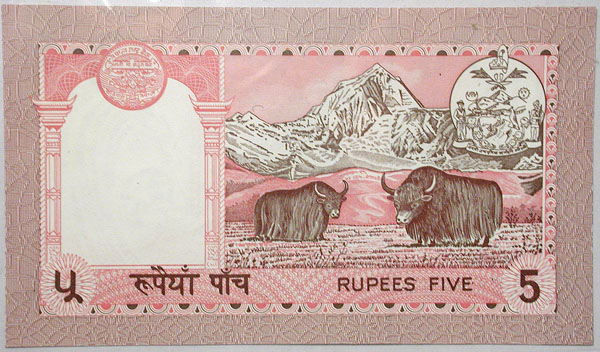 Bottom: 5 Rupees banknote (Thailand?) featuring yaks on the back.