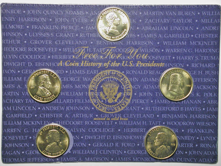 Left: 1984 Harry S. Truman 100th birth anniversary silver medal. Right: Set of brass medallions commemorating the first five U.S. Presidents.