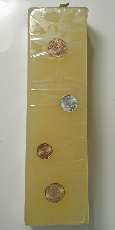 Left: Dick Cowley giving talk about coin glass. Center: Samples of coin glass. Right: A coin candle!