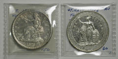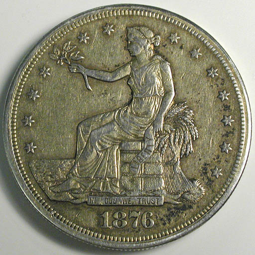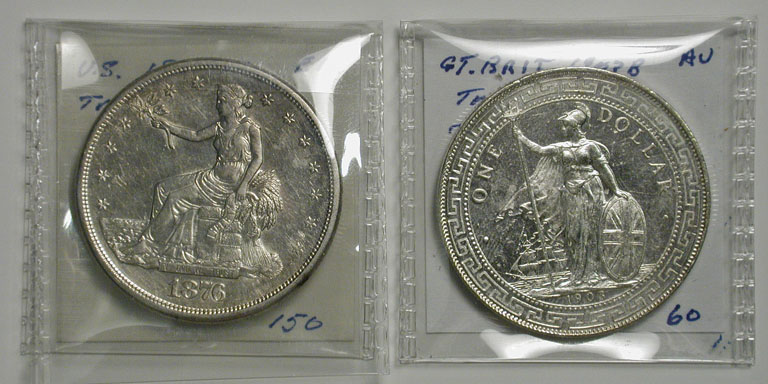 Left: U.S. and British Trade Dollars. Right: Case made from 1876-S U.S. Trade Dollar.