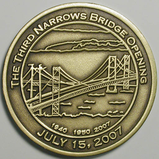 Left: Harbor History Museum medal commemorating third Tacoma Narrows Bridge Opening (2007).