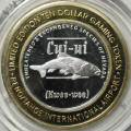 Left: 2005 "Wendover Will" commemorative silver piece from West Wendover, Nevada. Right: 2007 Reno-Tahoe International Airport $10 gaming token featuring the cui-ui (kwee-wee).
