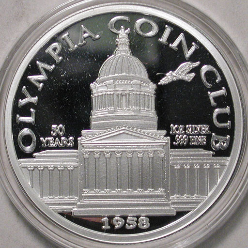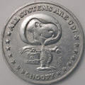 Left: 1969 Snoopy First Landing on the Moon commemorative medallion. Right: Olympia Coin Club 50th anniversary medal (1958-2008).