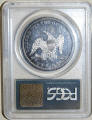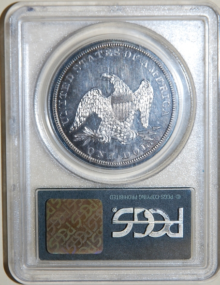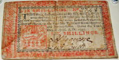 Left: 1777 Six Shillings colonial currency, printed in Philadelphia by John Dunlap. Right: 1845 Liberty Seated Dollar, PCGS PR63, J.A. Stack collection.