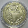 Left: c. 1880 currencies of the Republic of Hawaii. Center/Right: 2008 U.S. Mint Bald Eagle commemorative one dollar coin.