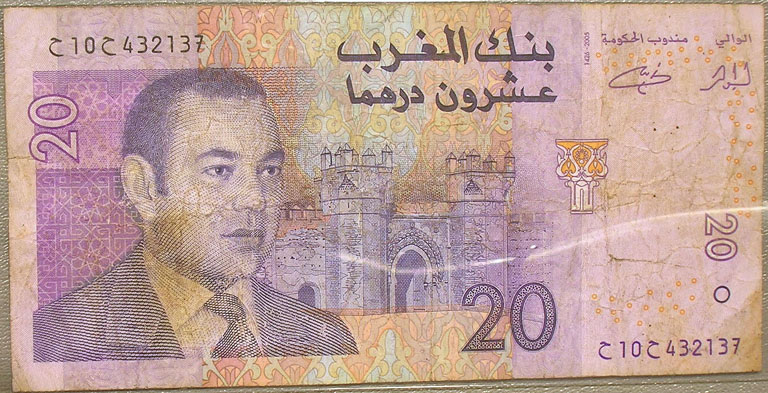 Top: Official "souvenir token" for Expo '74 World's Fair in Spokane. Bottom: Bank of Al-Maghrib 20 dirhams banknote.
