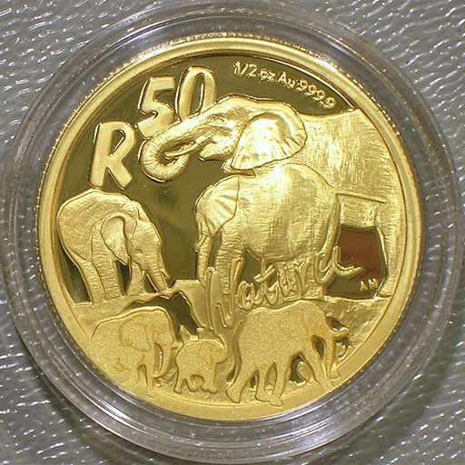 Left: 2000 Lincoln Cent "Extra Beard" variety. Center/Right: 2008 South Africa 50 rand gold coin depicting elephants.