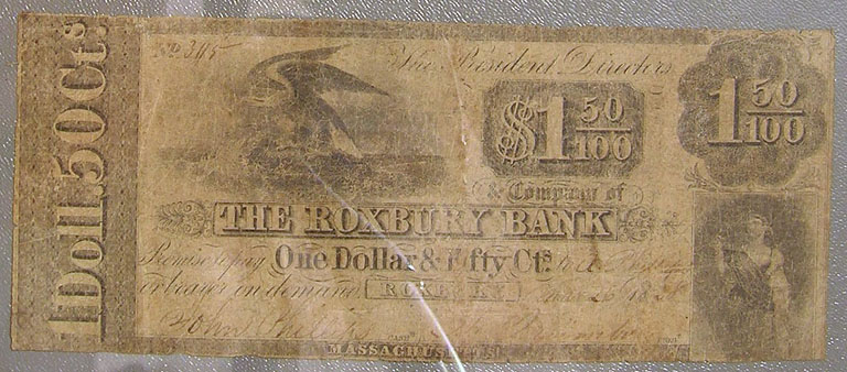 The Roxbury Bank $1.50 banknote from the 1800's.