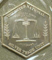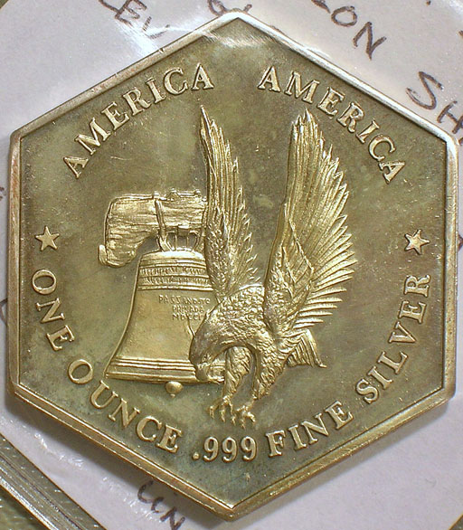 Left: United States Coast Guard Eagle commemorative medal. Right: Hexagonal one ounce "silver trade unit" featuring eagle and Liberty Bell.