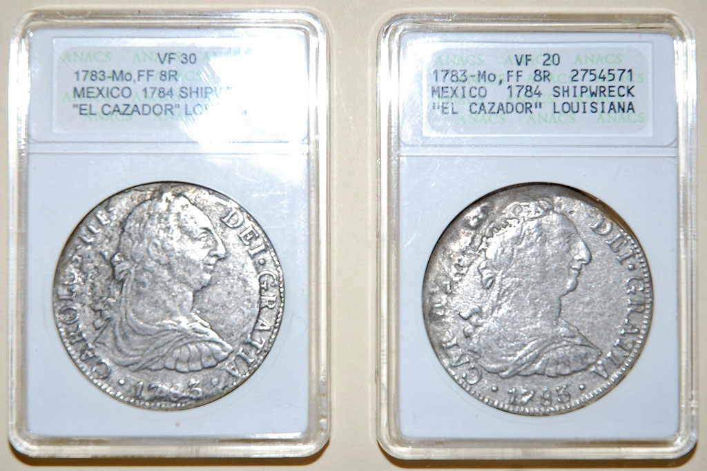 Left: 1783-Mo 8 reales coins (pieces of 8) from the shipwreck of the El Cazador.