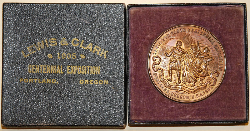 Left: 1905 Lewis & Clark Centennial Exposition medal with original box.