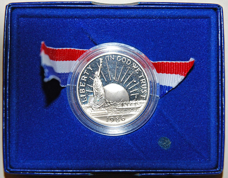 Right: 1986-S Statue of Liberty commemorative half dollar coin with original box.