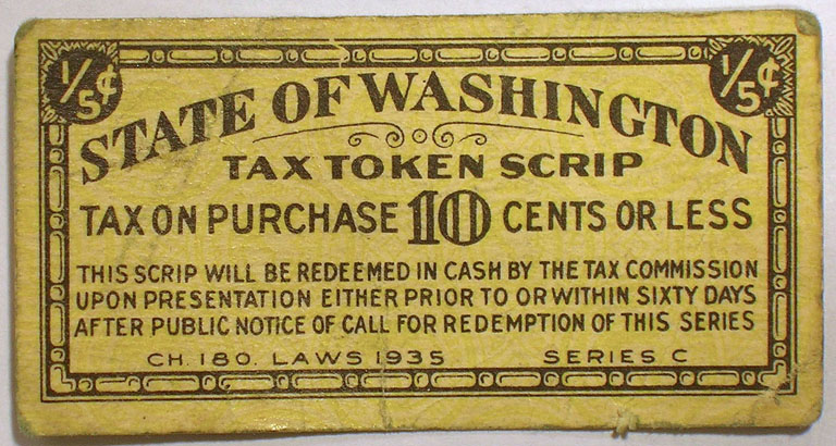 Bottom Right: 1935 State of Washington 1/5 cent tax token scrip.