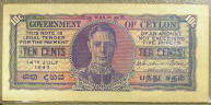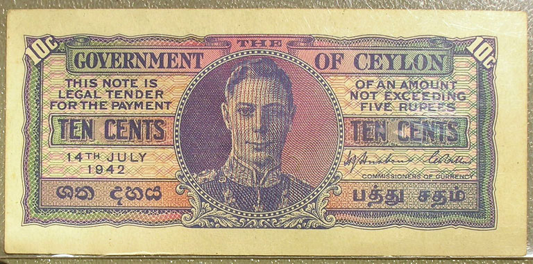Bottom Left: 1942 Ceylon 10 cents banknote.