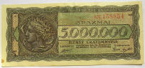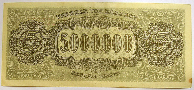 Middle: 1944 Greek 5,000,000 drachma inflation banknote.
