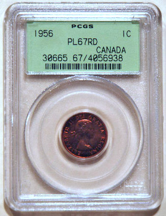 Left center: 1956 Canadian cent, PCGS PL67RD.