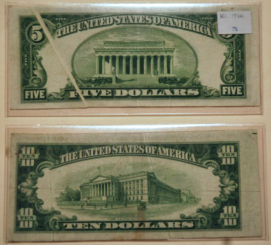 Right: $5 and $10 Federal Reserve Notes with errors (fold and improper cut).