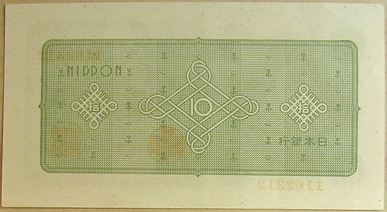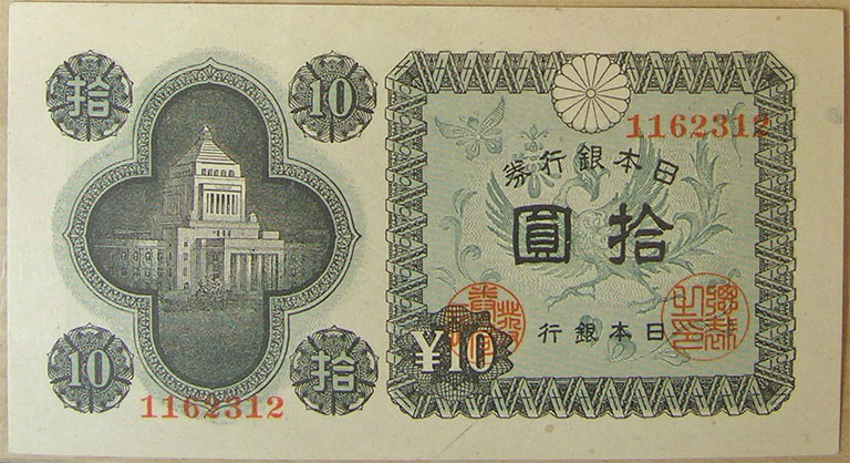 Bottom: Japan 10 yen banknote, 1946-1951 era.